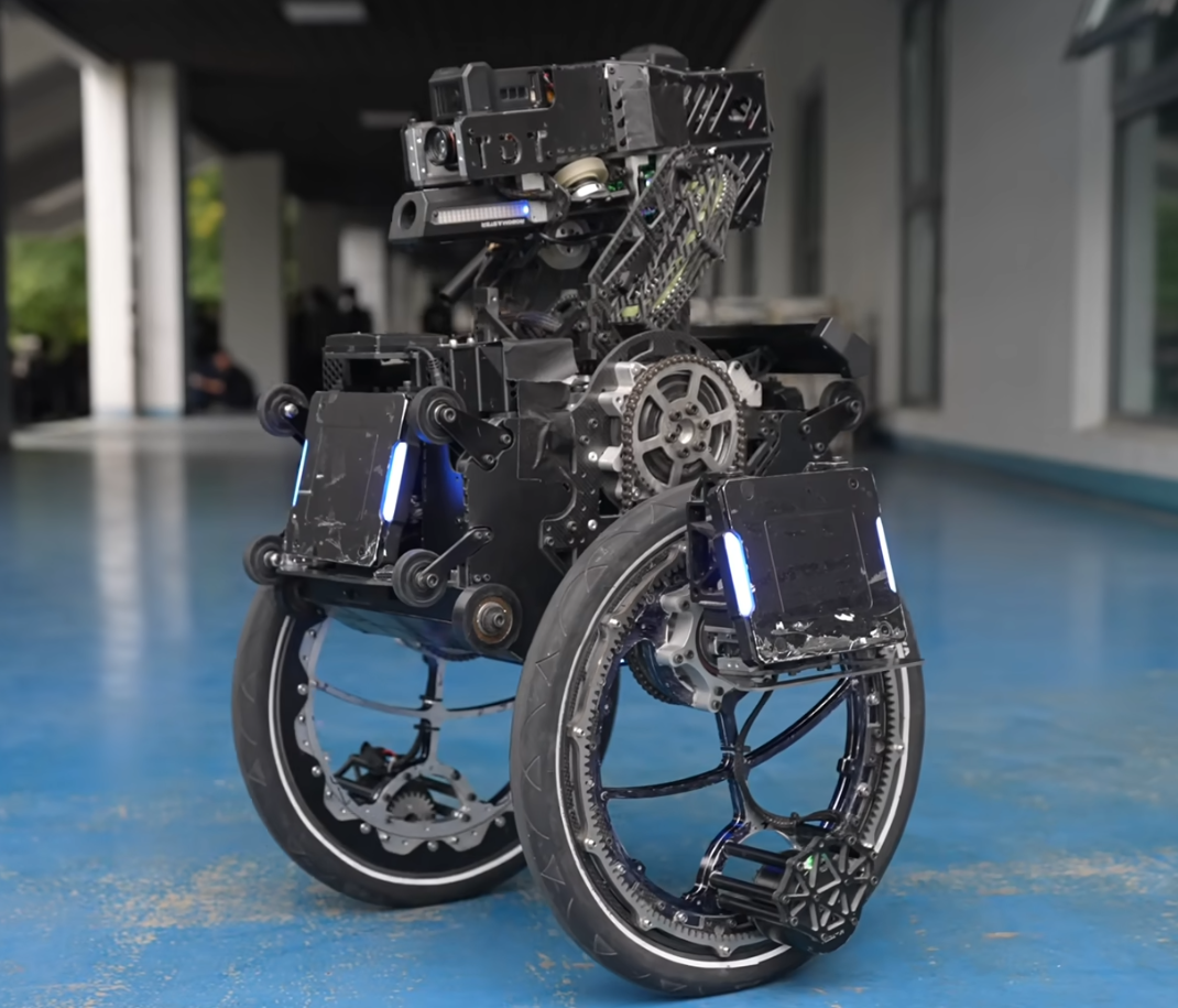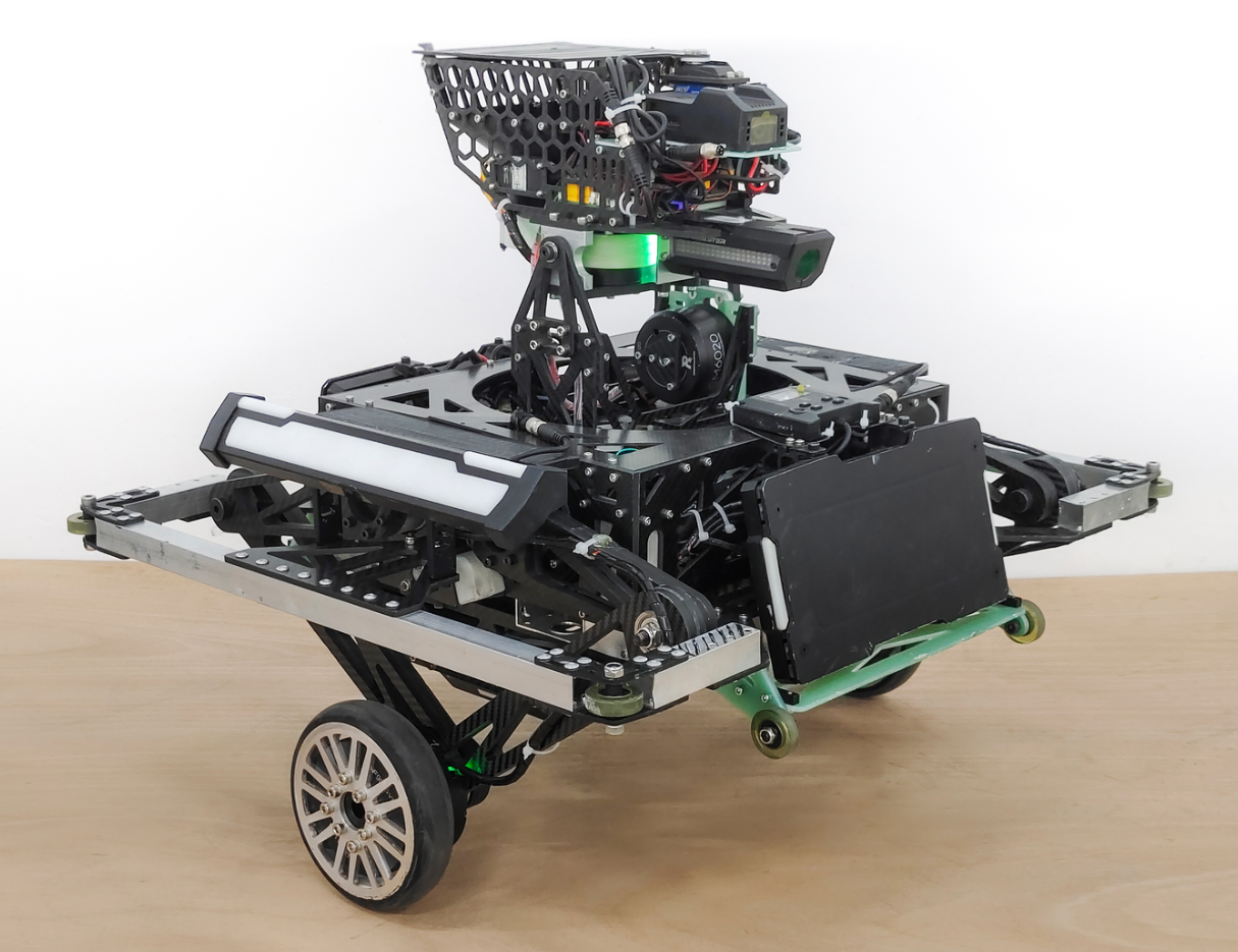 - 两轮式: 又被称为“板凳平衡”,因其结构和控制都较为简单,且引入动量块可以得到更优的控制效果,在23赛季之前被大部分队伍采用。其控制建模可以简化为一阶轮式倒立摆,采用简单的串级PID或者LQR控制器就可以得到较好的控制效果。但随着地形复杂度逐渐增加,两轮式平衡步兵的地形适应能力有限,该方案被大部分队伍摒弃。